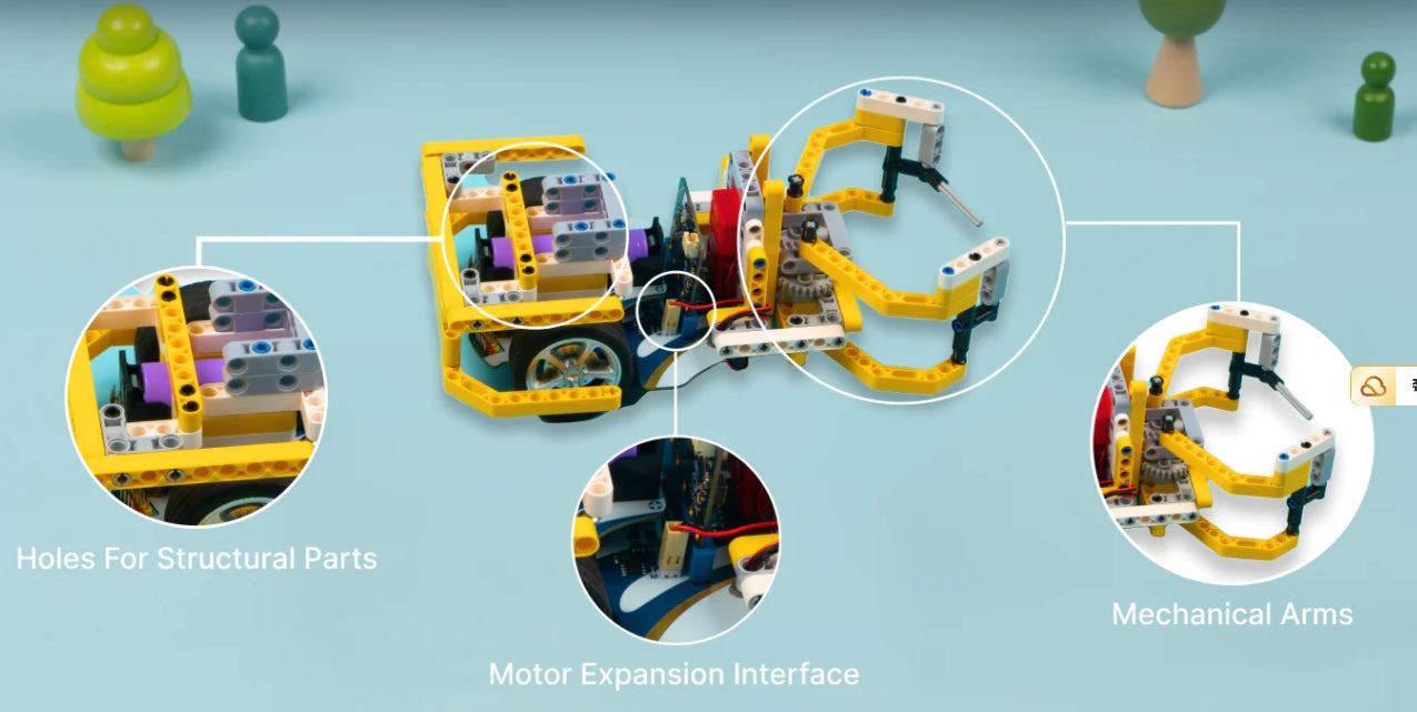 4. More expansion interface.On the regular version, even though there is an expansion kit, there are still fewer locations that can be expanded, and the structures that can be expanded are very limited. This is obviously not enough for users to realise more creative ideas. So on the cutebot pro kit we have expanded the peripheral interfaces, making it possible to add additional motors, sensors and building blocks to prepare for the creation of more complex cases. We use the Cutebot pro for designing race structures in our races in China because of its scalability.
