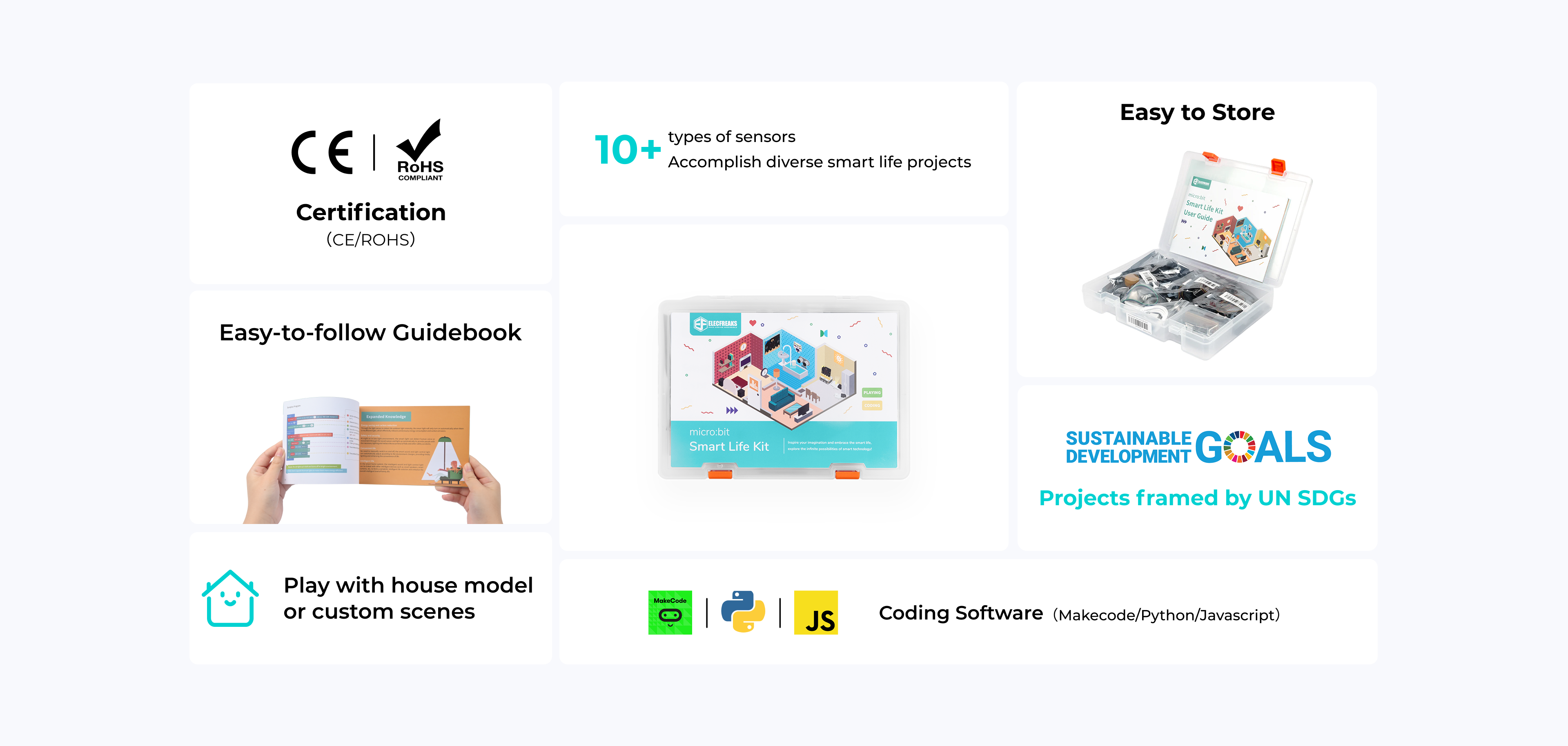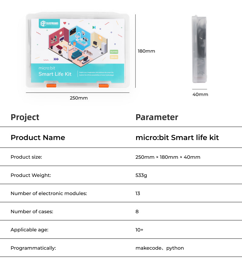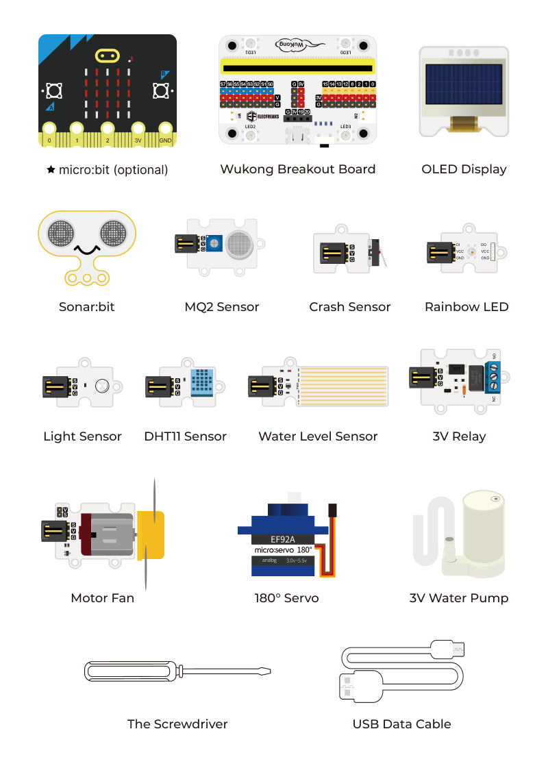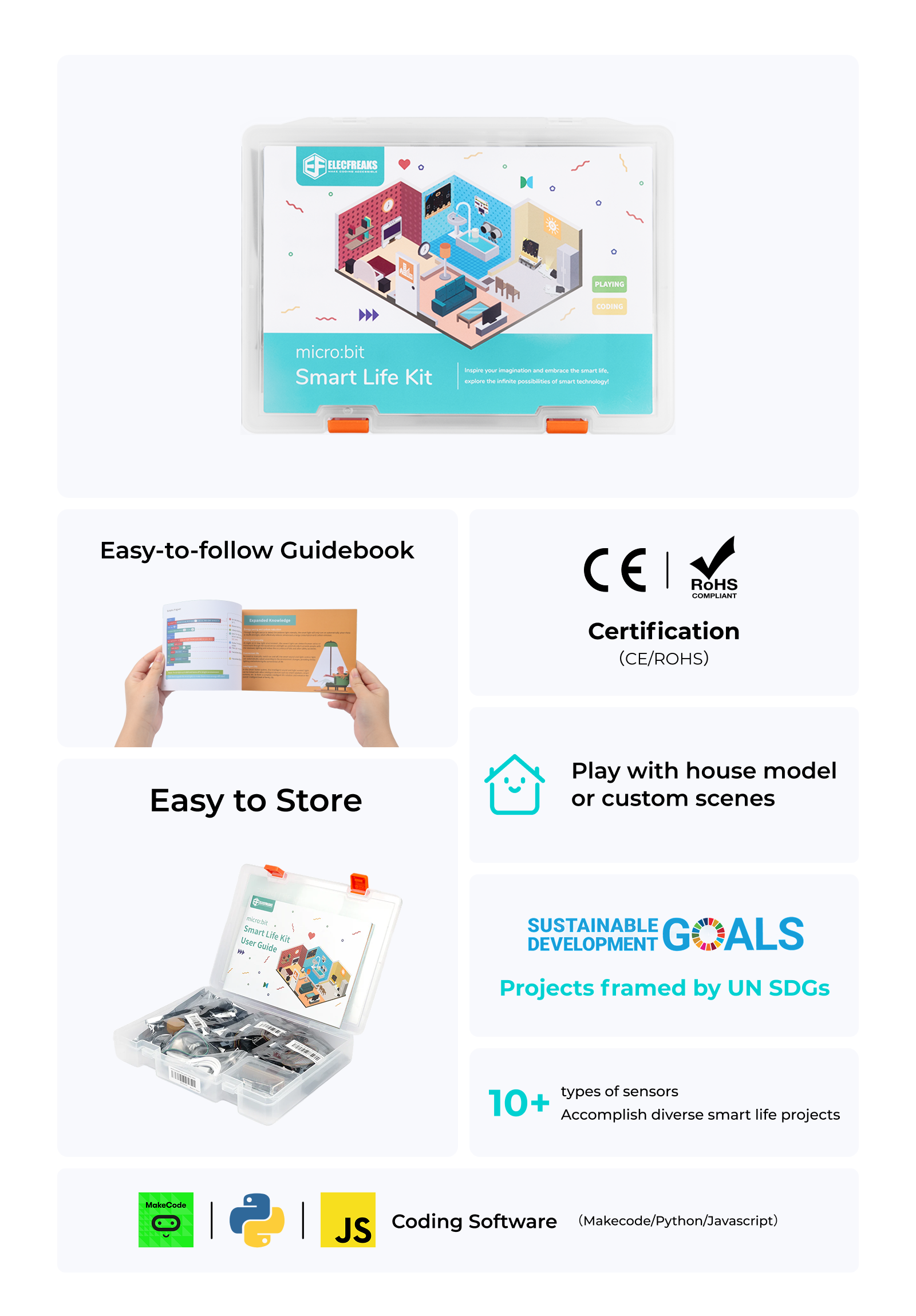 The ELECFREAKS micro:bit Smart Life Kit, an integrated set of water pump, relay, ultrasonic sensor, light sensor, water level sensor, MQ2 smoke sensor, servo, temperature and humidity sensor, fan module, and collision sensor, not only provides rich hands-on materials, but also stimulates children's creativity and exploratory spirit through intelligent sensing, environmental monitoring, and automated control projects. The ELECFREAKS micro:bit Smart Life Kit, which closely connects technology and life, opens up the children's journey to a smart life.