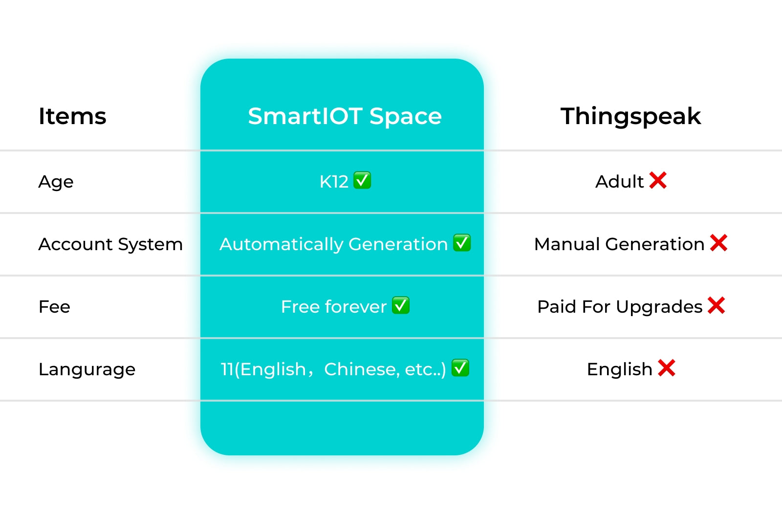 "Why choose SmartIoT Space over ThingSpeak? Built for education, not just engineers. Enjoy 8 key advantages: K12-focused tools, automatic data workflows, 11-language support, and 100% free access—while ThingSpeak caters to adults with manual setups, paid upgrades, and limited English-only access. "