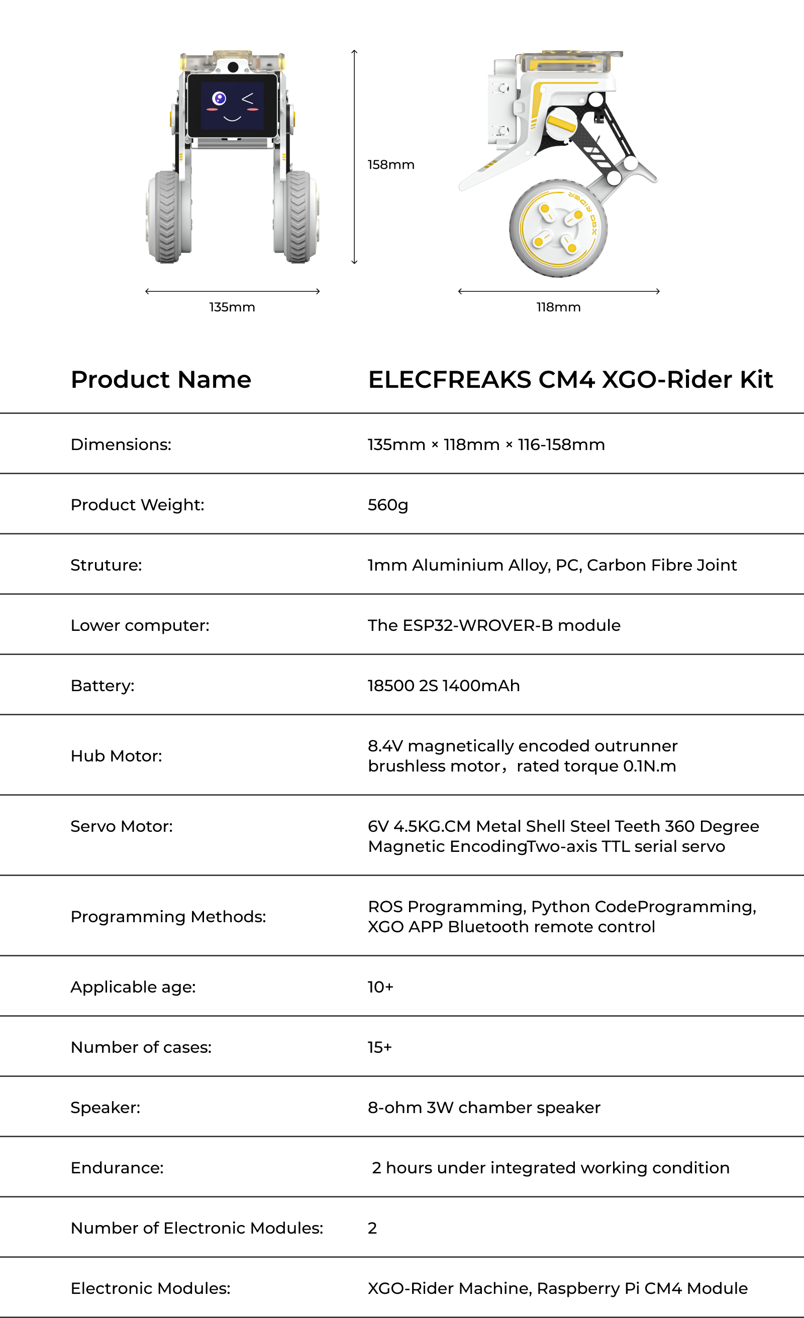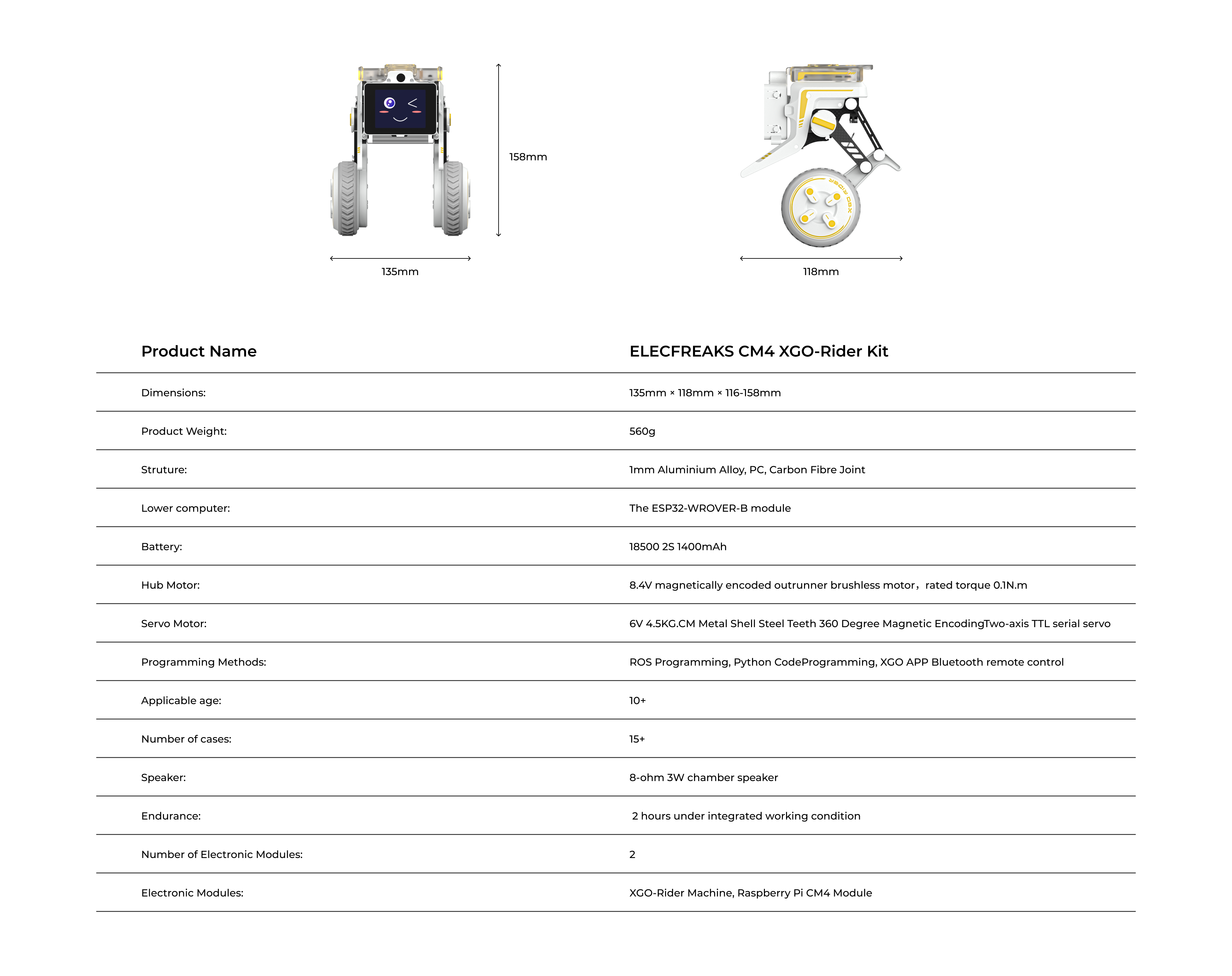 Powered by Raspberry CM4, the XGO-Rider is open-sourced, enabling users to program it using Python. Moreover, it is equipped with Robot Operating System (ROS) packages for developers. The CM4 XGO-rider is especially suitable for experienced developers to explore more possibilities.