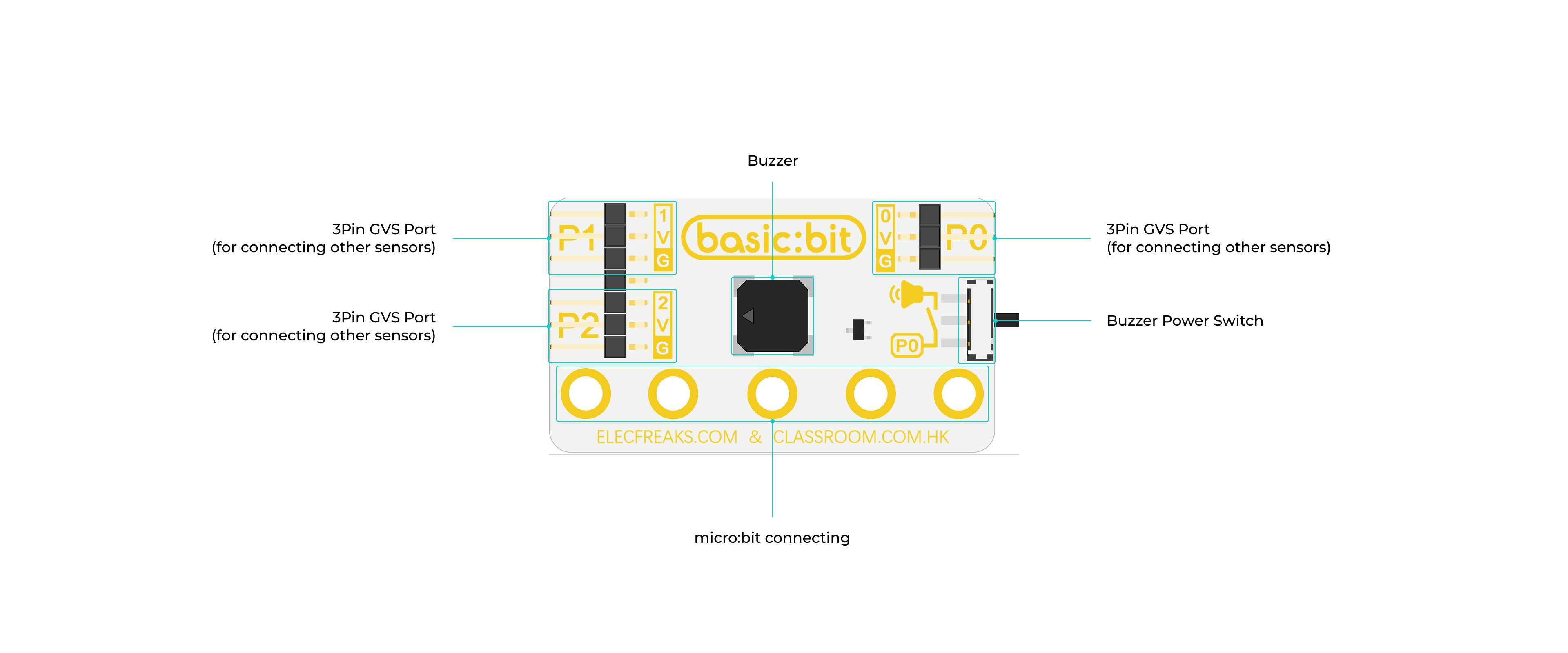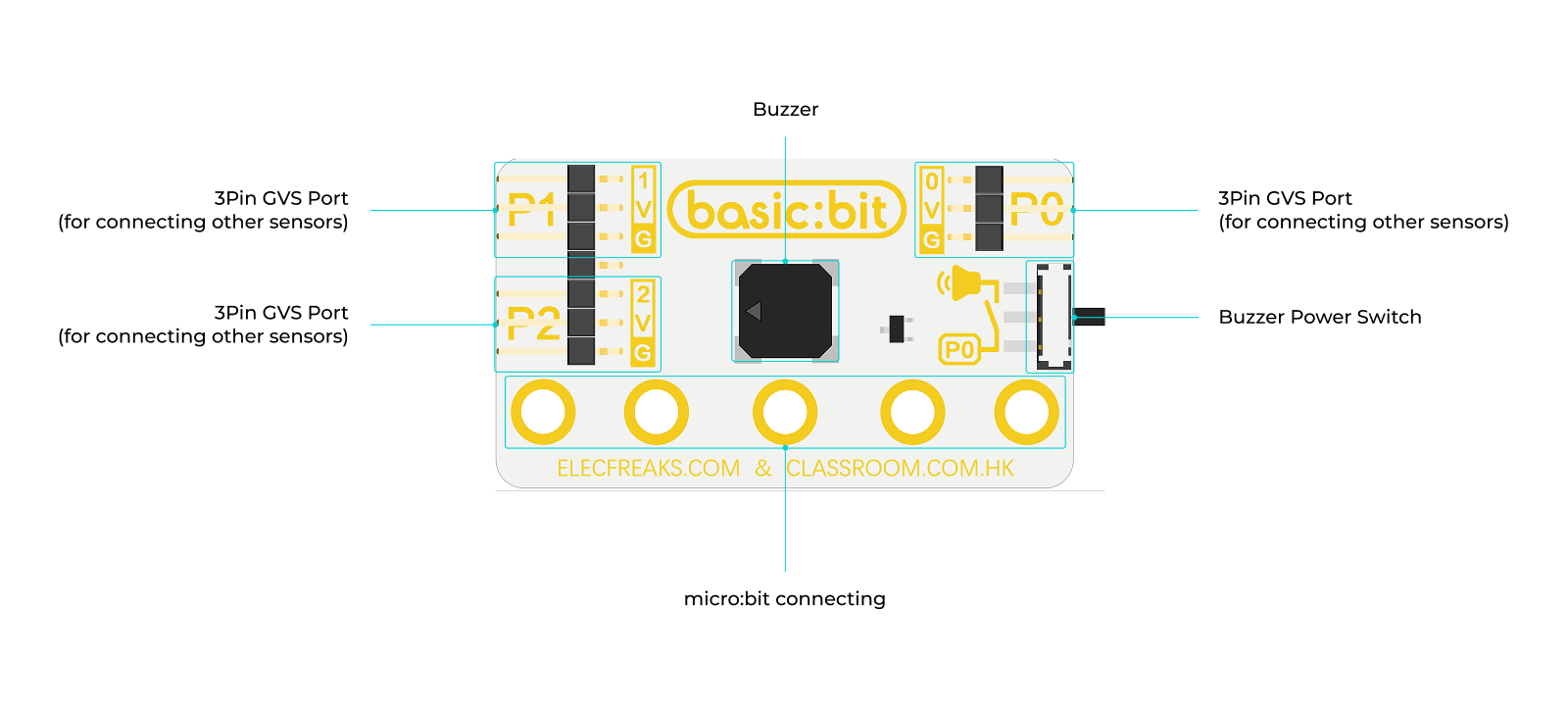 Basic:bit is a basic breakout board of micro:bit. It carries a buzzer and three groups of GVS pins(P0/P1/P2) on board. Each group of GVS pins separately leads out the IO port, 3V port and GND port on micro:bit. Small size with simple structure, it is quite enough for you to complete 98% micro:bit projects.