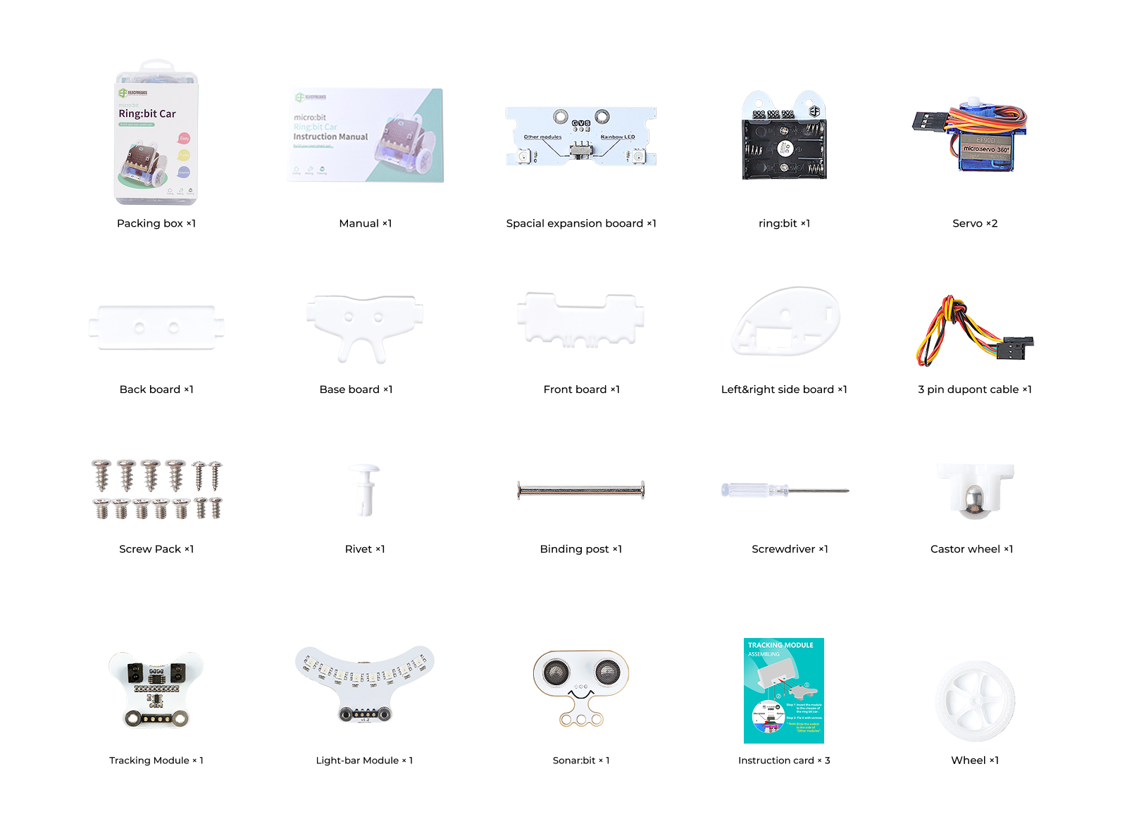 The ELECFREAKS Ring:bit Kit V2 micro car is a small DIY smart micro car driven by the BBC micro:bit and the ELECFREAKS Ring:bit. A basic Ring:bit micro Car can be easily programmed to run autonomously, with remote control, and even create rainbow beacons of light. Just add one of the many extensions available and your Ring:bit Car can do even more things like line and light following, obstacle avoiding, drawing, and more!