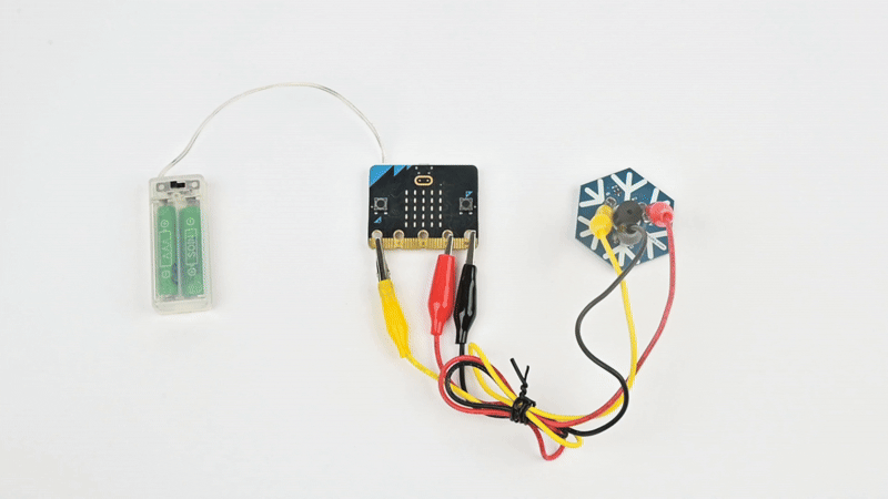 Use black, red, and yellow crocodile clips to connect micro:bit’s GND, 3V, and 0 ports respectively to the buzzer’s G, V, and S ports.
