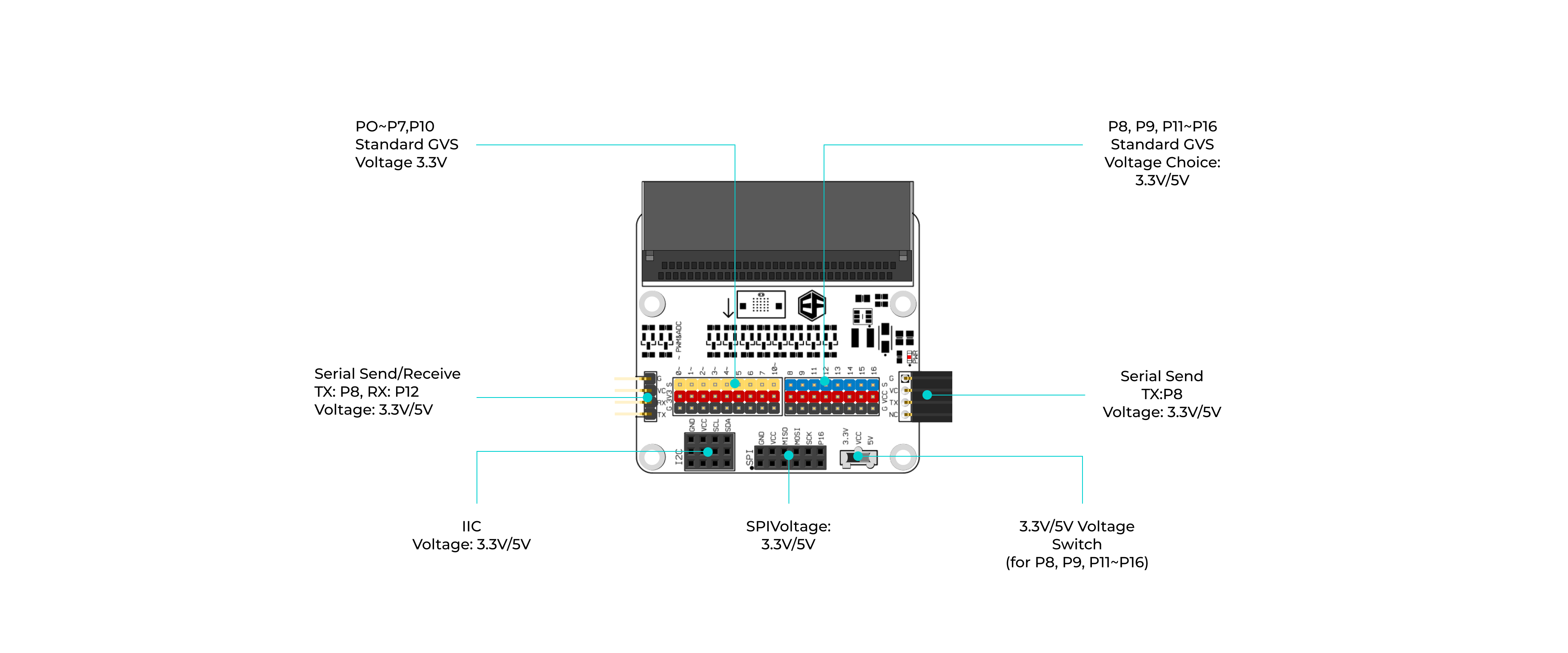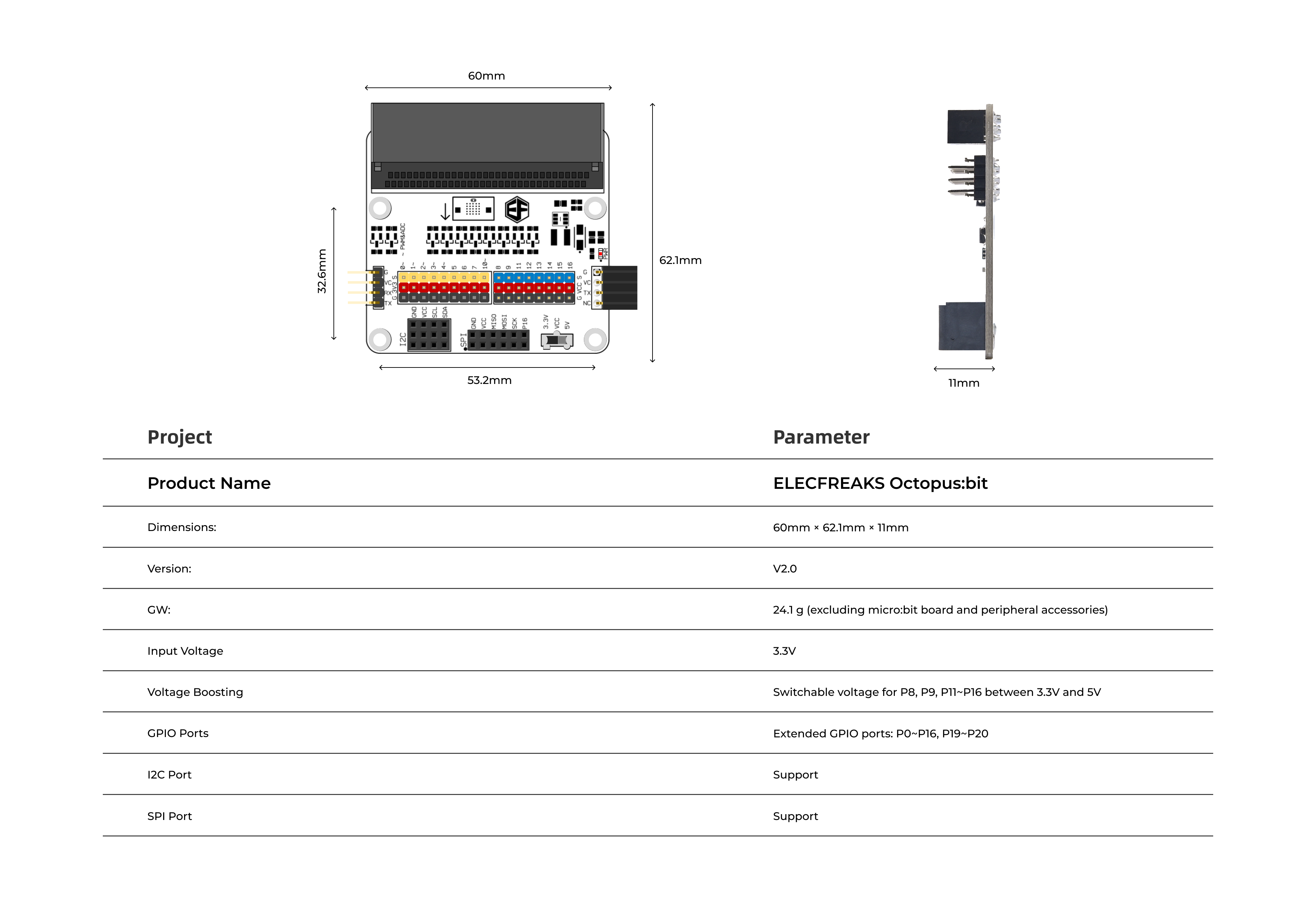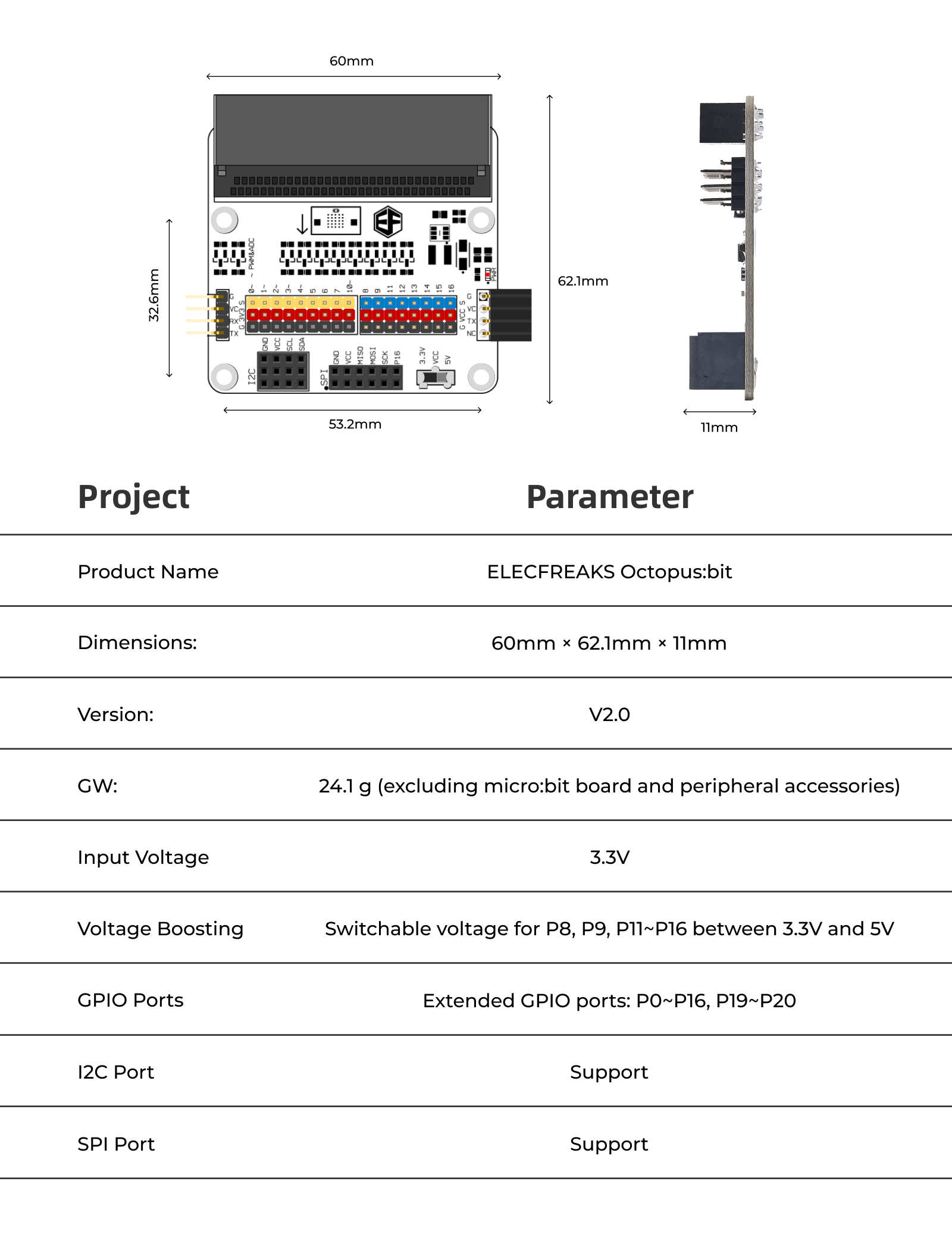 micro:bit breakout board is a kind of breakout board for micro:bit. It can lead out GPIO port, serial port, IIC port, and SPI port on the micro:bit board. The biggest feature of Octopus:bit is that it can switch electric levels for some GPIO ports, which makes micro:bit available to be adapted to 5V sensors.