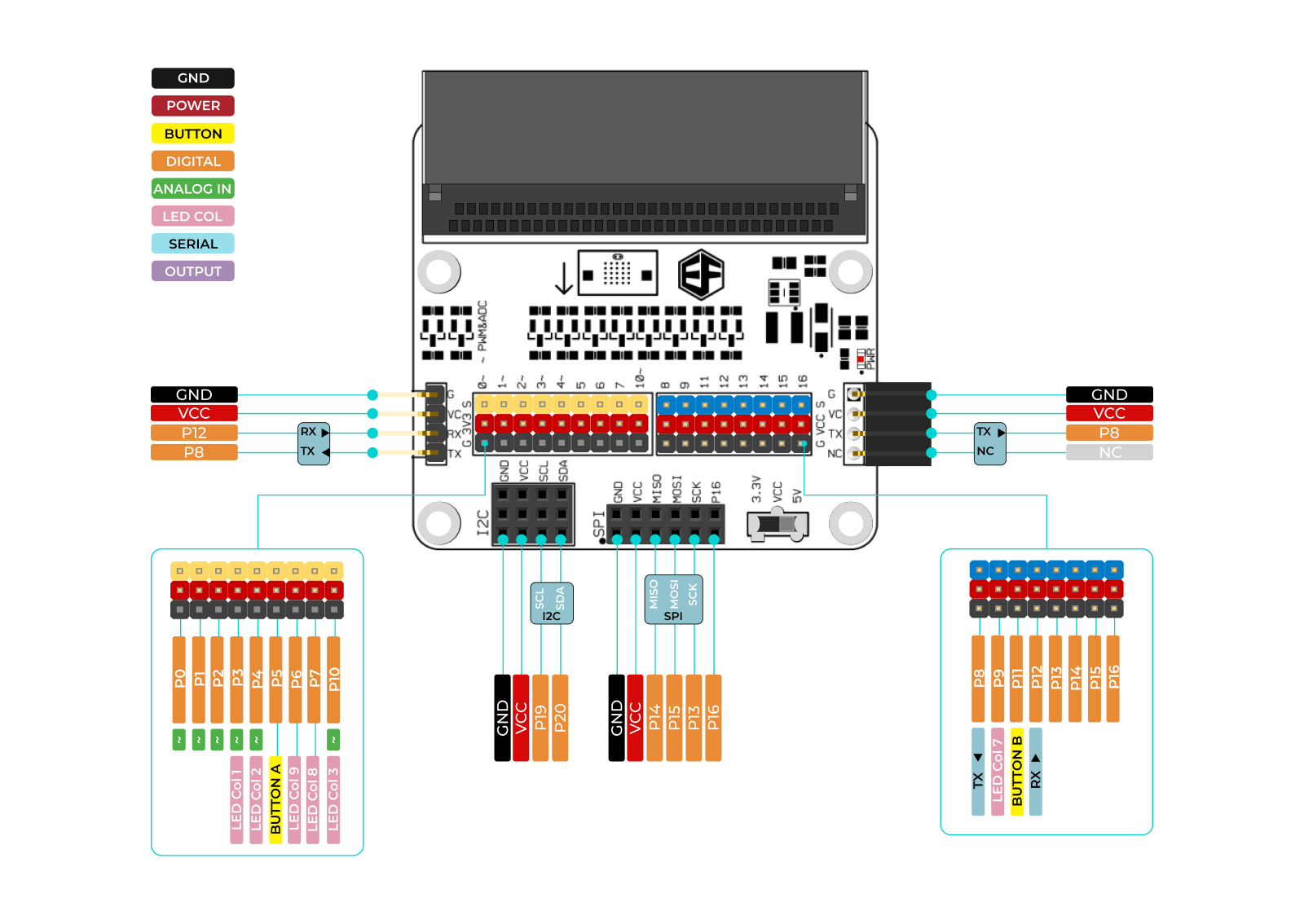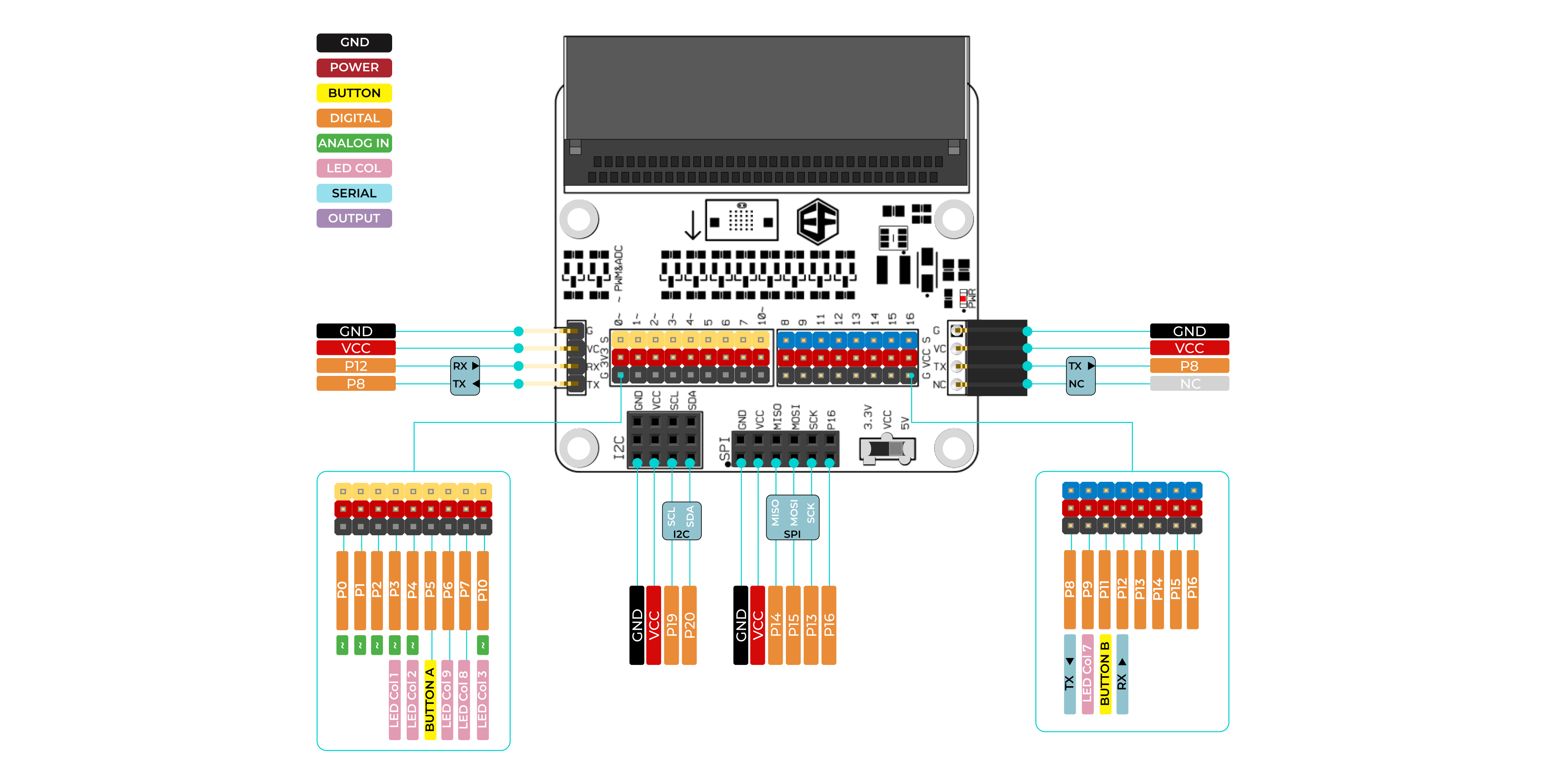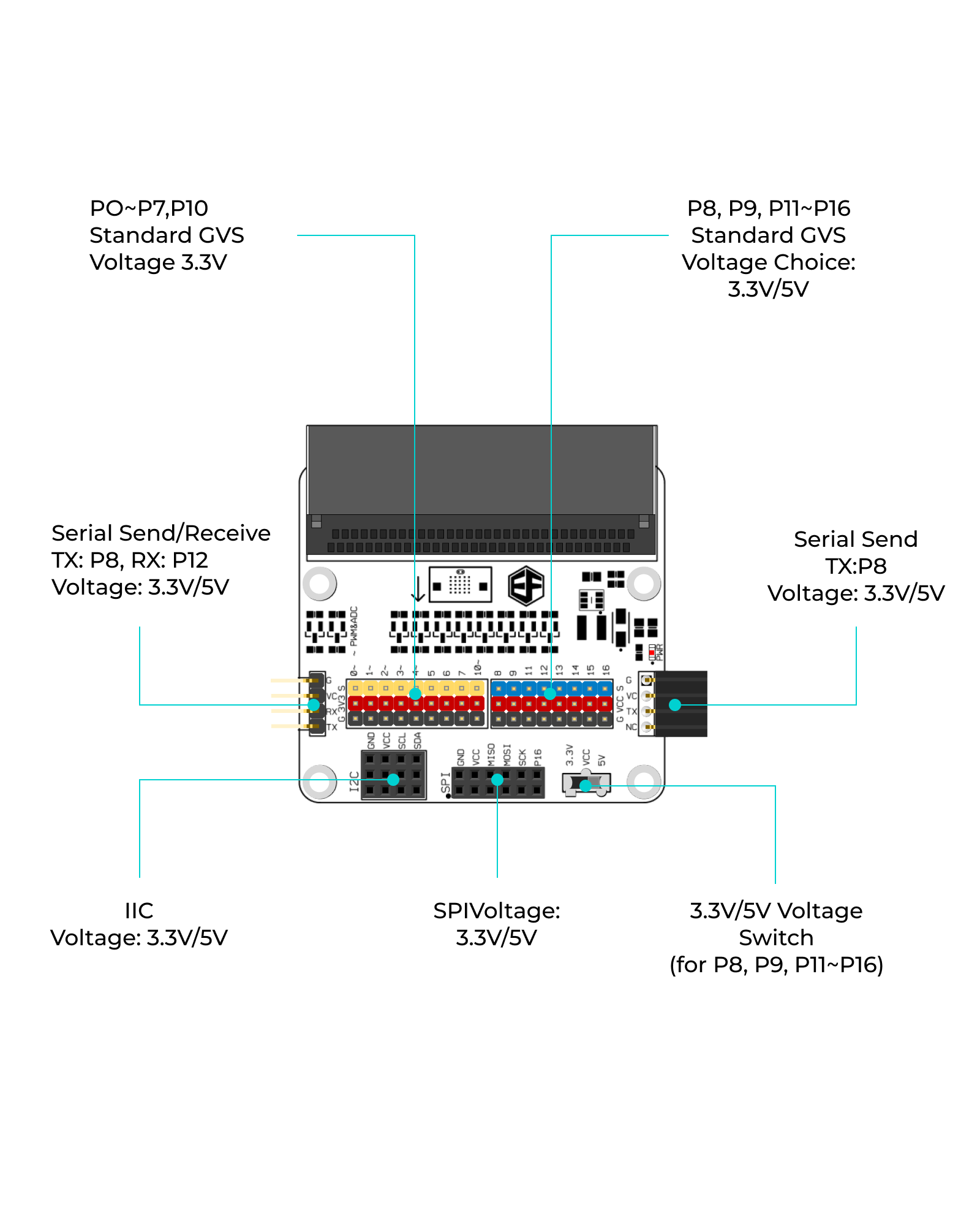 micro:bit breakout board is a kind of breakout board for micro:bit. It can lead out GPIO port, serial port, IIC port, and SPI port on the micro:bit board. The biggest feature of Octopus:bit is that it can switch electric levels for some GPIO ports, which makes micro:bit available to be adapted to 5V sensors.